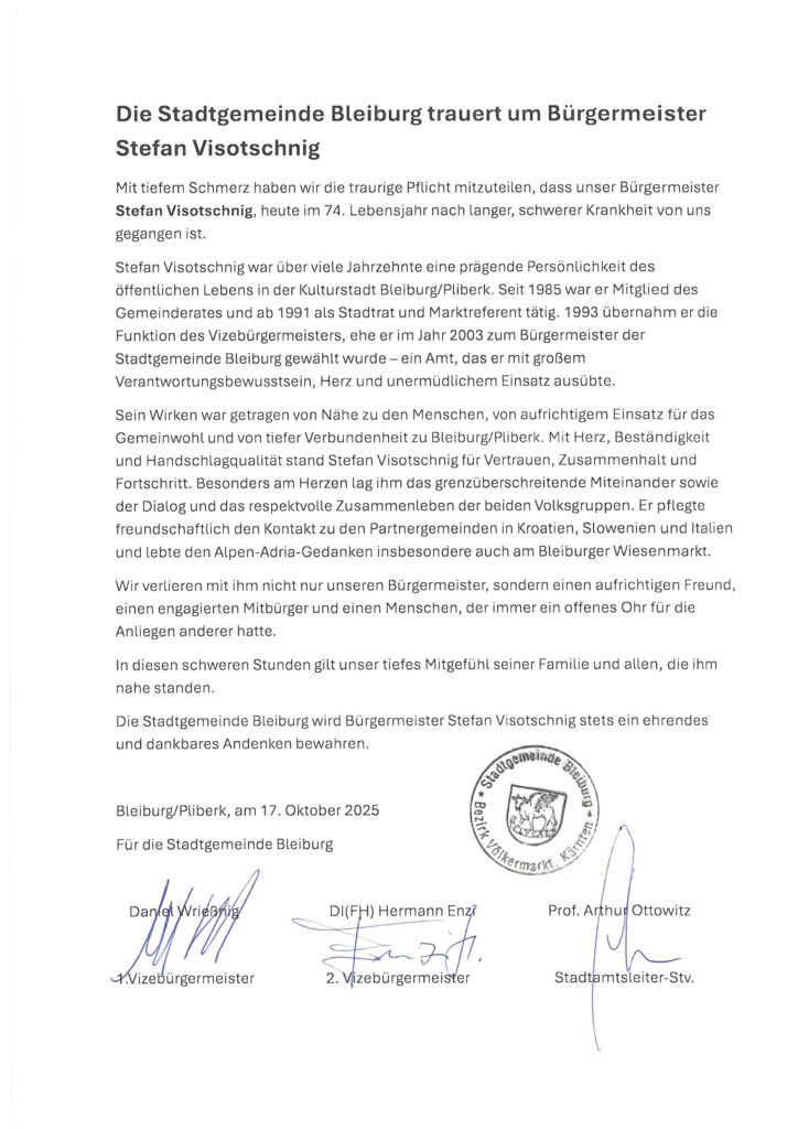 Die Stadtgemeinde Bleiburg wird Bürgermeister Stefan Visotschnig stets ein ehrendes und dankbares Andenken bewahren.