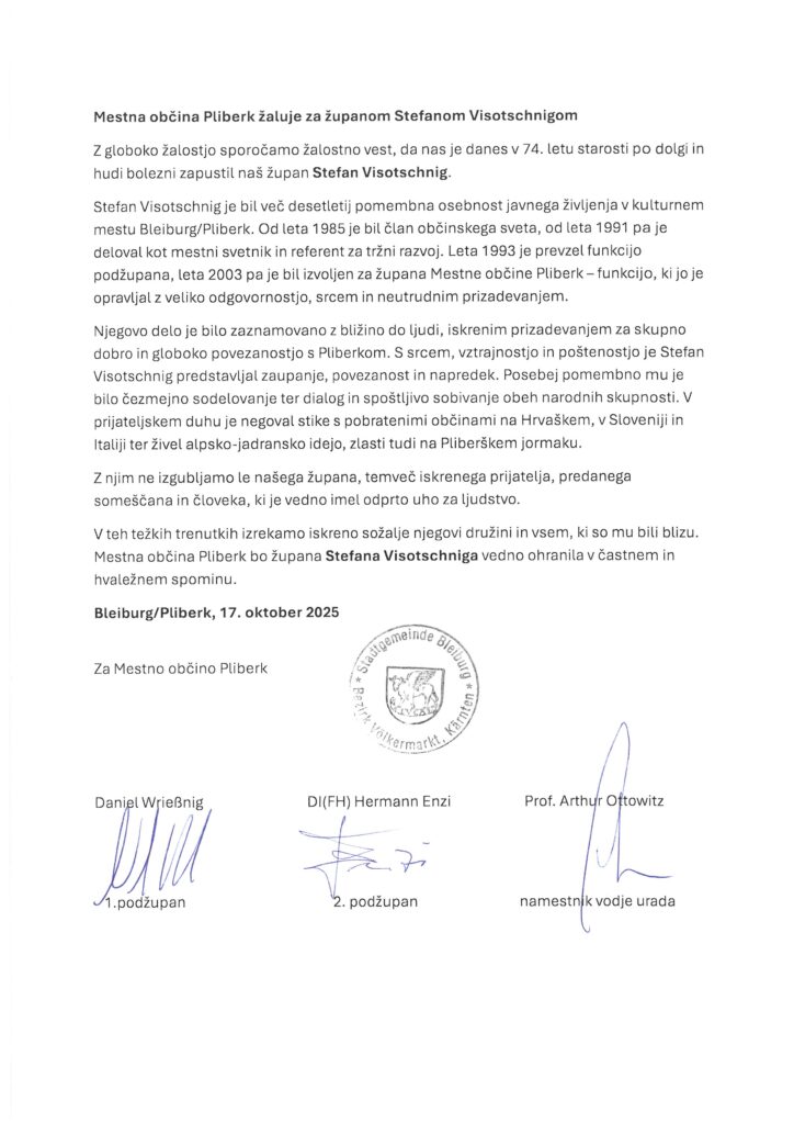 Mestna občina Pliberk bo župana Stefana Visotschniga vedno ohranila v častnem in hvaležnem spominu.